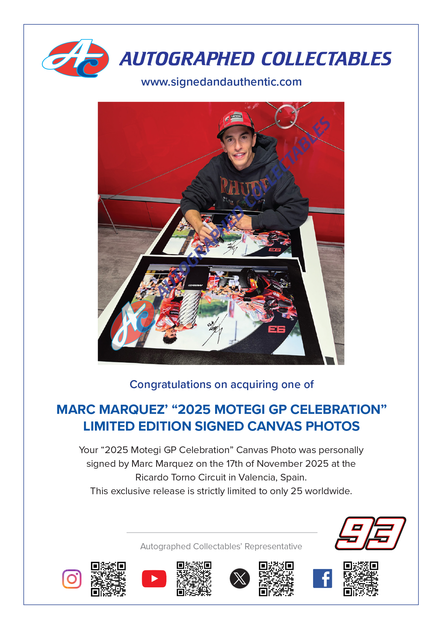 Each piece is backed by an Autographed Collectables 100% Guarantee of Authenticity which includes the signing date, location, edition size as well as a photo from the signing session. The signed photo also includes the Official Marc Marquez #93 hologram.