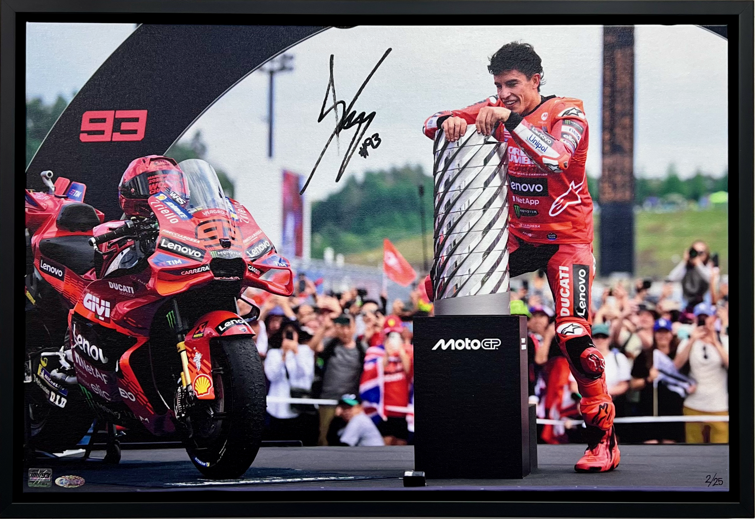 This beautiful photo printed on canvas captures Marc placing the 2025 Championship plaque on the Official MotoGP Trophy. Limited to only 25 worldwide, Marc signed this exclusive edition at the Ricardo Torno Circuit in Valencia, Spain, November 17th 2025.