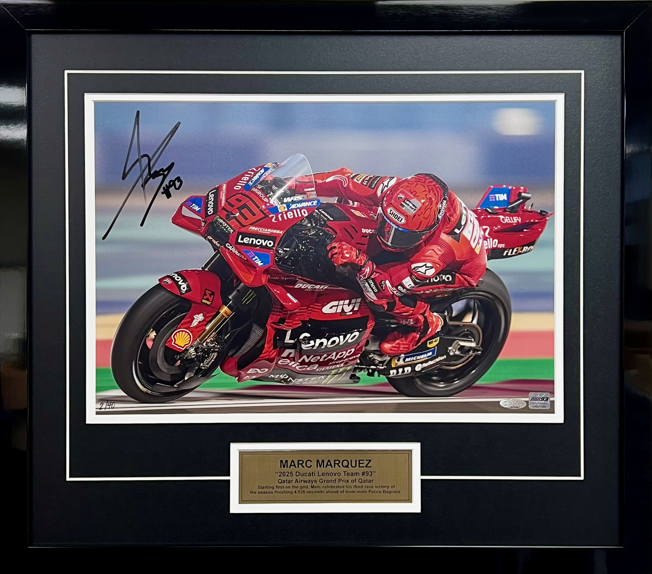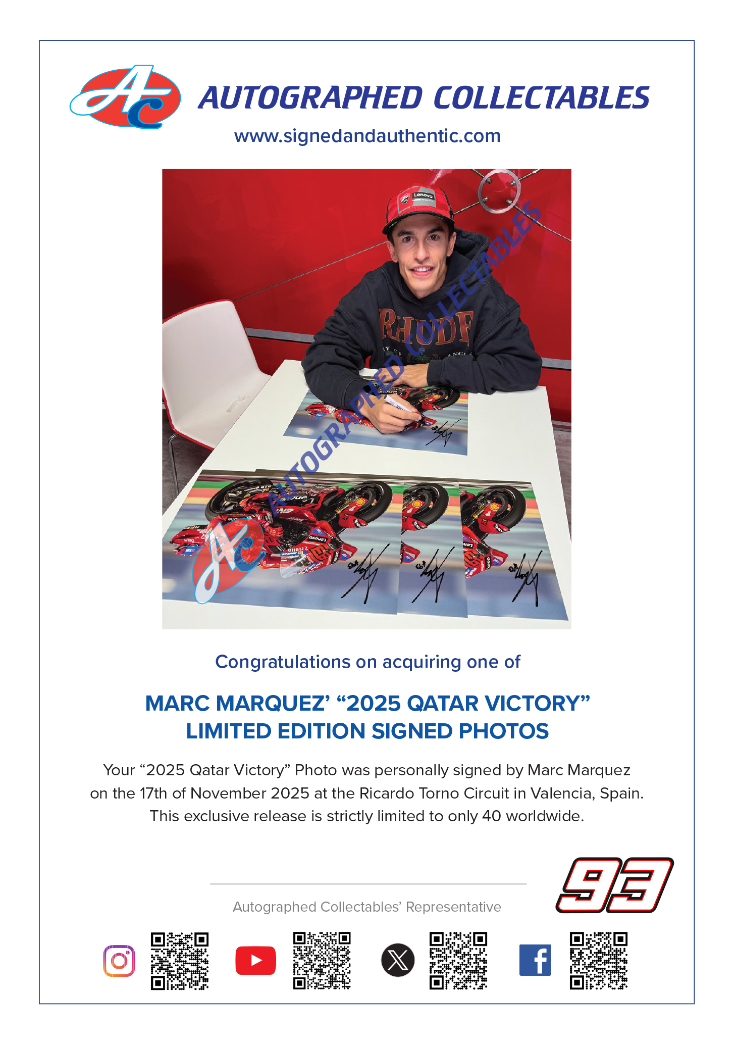 This beautiful photo captures Marc racing to victory during the 2025 Qatar Grand Prix. Limited to only 40 worldwide, Marc signed this exclusive edition at the Ricardo Torno circuit in Valencia, Spain November 17th 2025.