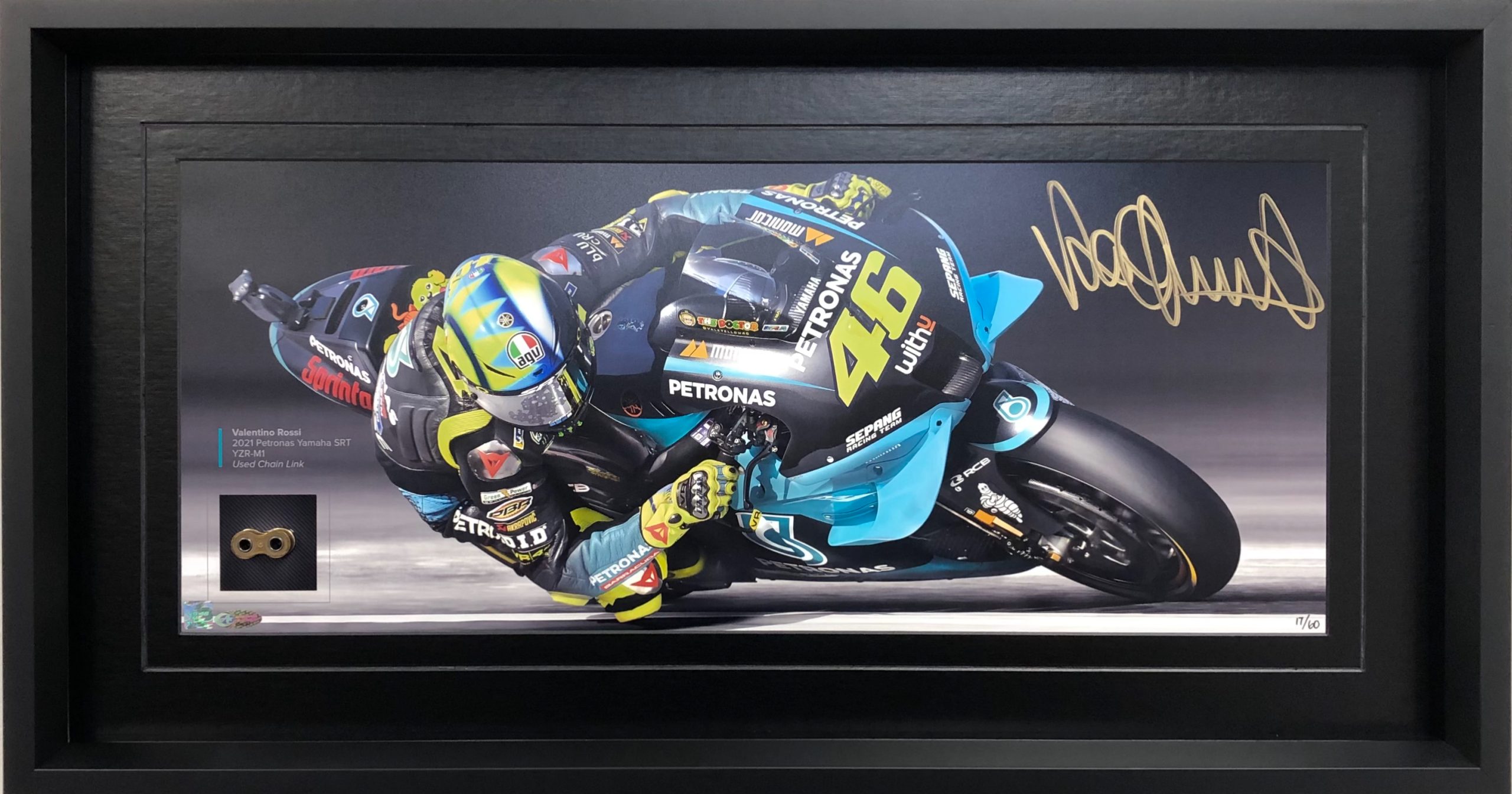 Your 2021 Valentino Rossi Piece of a Champion photo will be personally signed by Valentino Rossi in the very near future in Tavullia, Italy. This exclusive release is strictly limited to only 60 worldwide and it also includes an actual race used chain link from Rossi’s 2021 Yamaha YZR-M1.